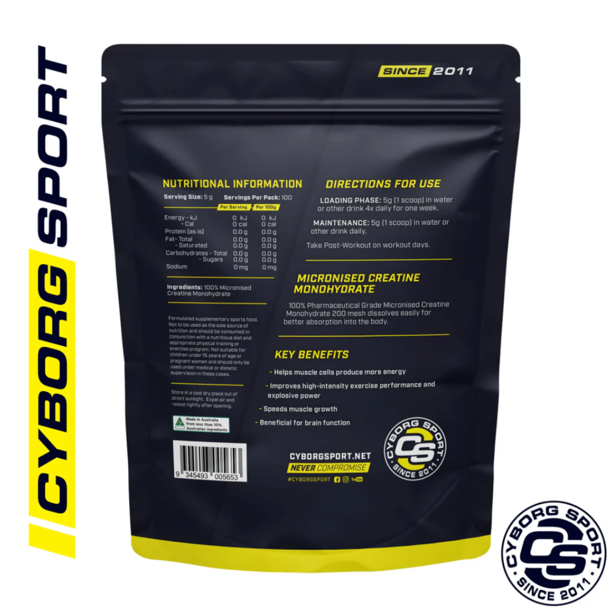 Cyborg Sport Creatine is your ultimate performance supplement—crafted with 100% pure creatine monohydrate, backed by decades, and trusted by athletes worldwide. This ultra-pure, micronized formula is designed to support muscle growth, strength output, High power, and rapid recovery, making it the go-to product for anyone serious about improving athletic performance. Cyborg Sport Creatine offers maximum results with zero fillers or additives. Whether you’re in the gym, on the field, or just starting your fitness journey, this creatine helps fuel your body to push harder and recover faster.