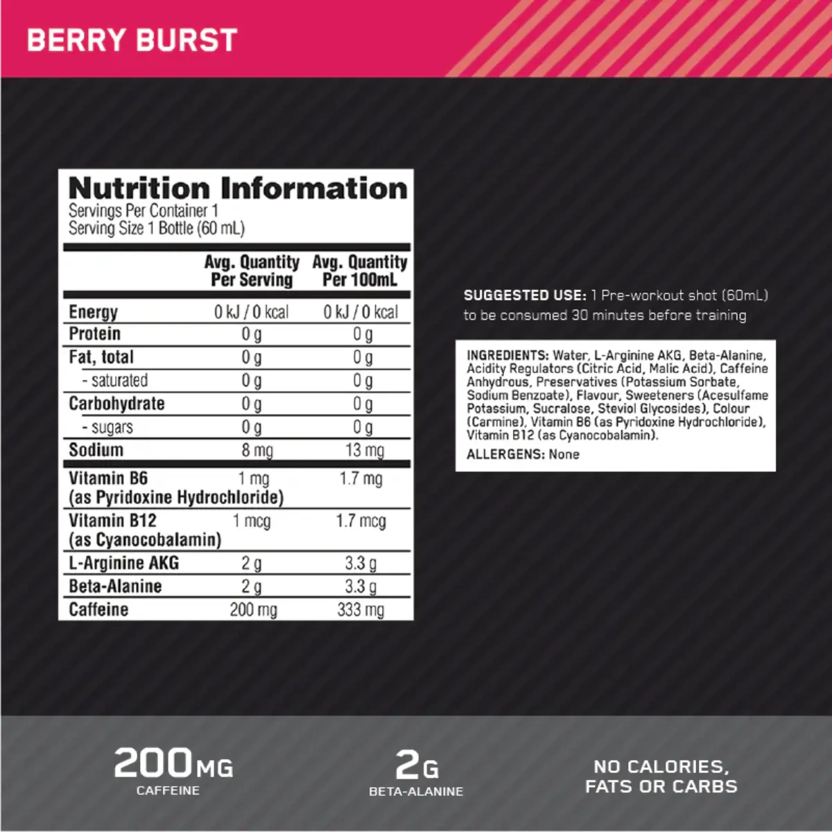 Optimum Nutrition Pure Pre 200 Pre-Workout Shot with zero sugar, plus caffeine and added vitamins B6 & B12. Shots to be consumed 30 minutes before training.