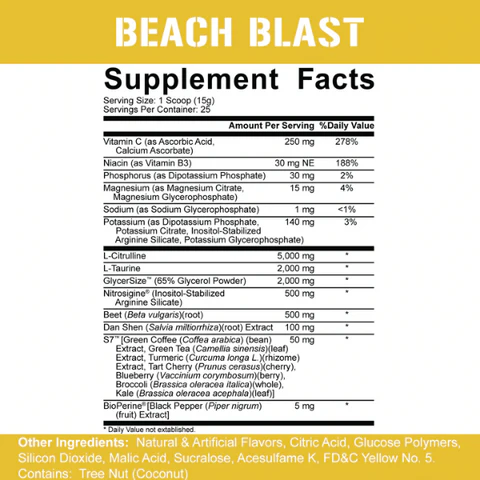 Typical Nitric Oxide boosters rely on Arginine to increase blood flow and pumps. 5% Nutrition’s Full as F*ck uses FOUR GRAMS of L-Citrulline, a superior nitric oxide source, to deliver the most insane pumps you could expect from a pre-workout supplement.